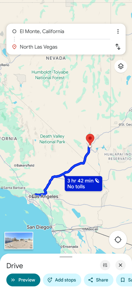 Map showing the distance between El Monte, California and North Las Vegas, Nevada